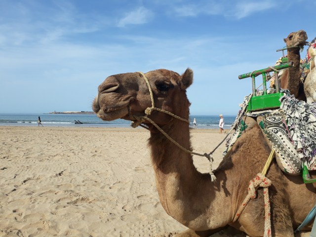 Balades en dromadaires pour admirer les beaux couchers de soleil légendaires de la ville d’Essaouira.